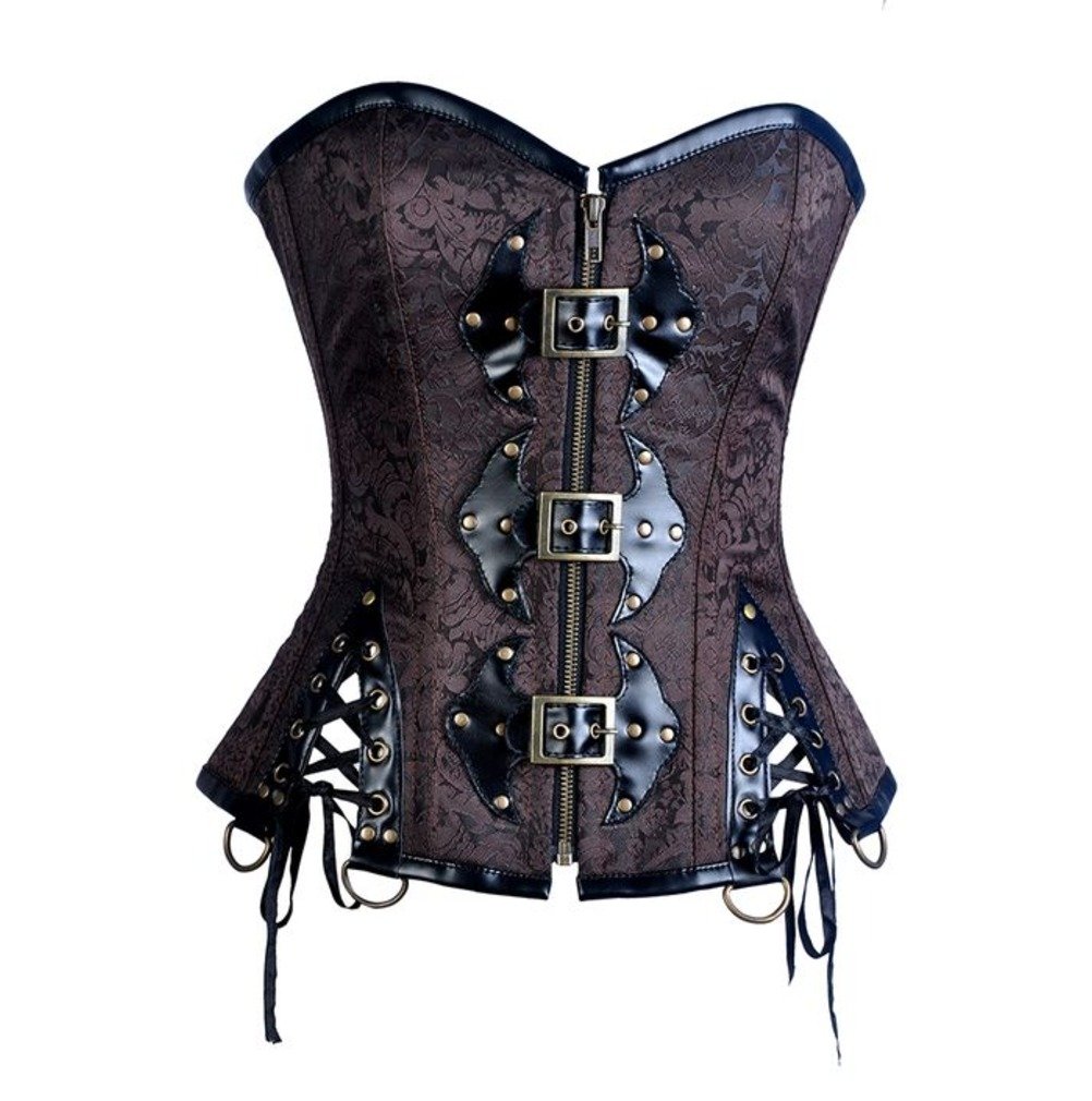 - Black and brown steampunk corset made from brocade and faux leather for a bold vintage look.