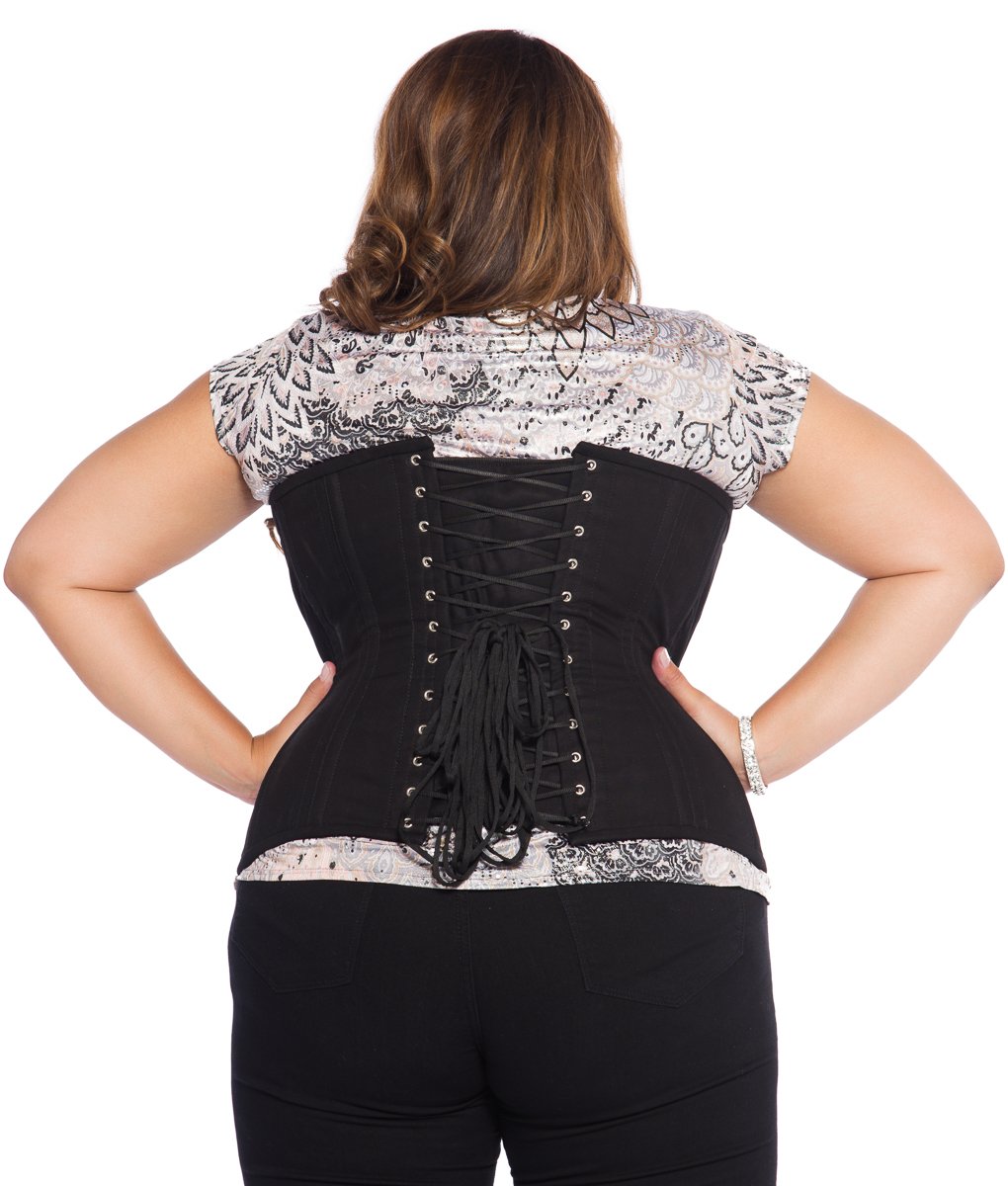 This boned corset is carefully crafted with 24 steel bones, including 4 rigid steel bones and 20 spiral steel bones. The steel busk at the front secures the fit while the traditional plus size lace up corset back makes adjusting simple. A wide 5-inch modesty panel smooths the look, making this underbust plus size corset perfect under clothing or styled as a statement piece.
