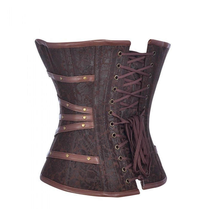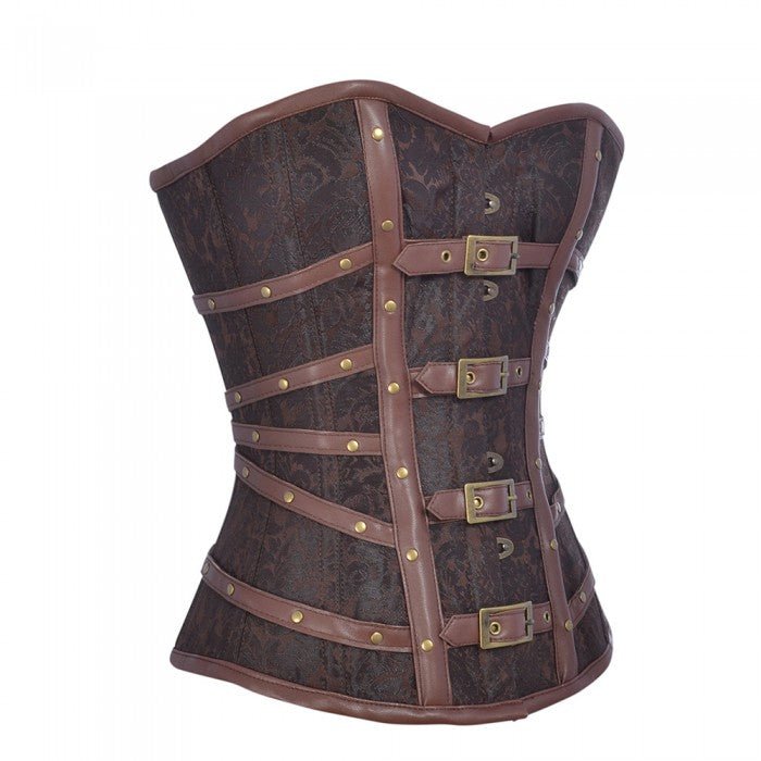 - Bold brown brocade steampunk corset with buckle detail for edgy punk style.