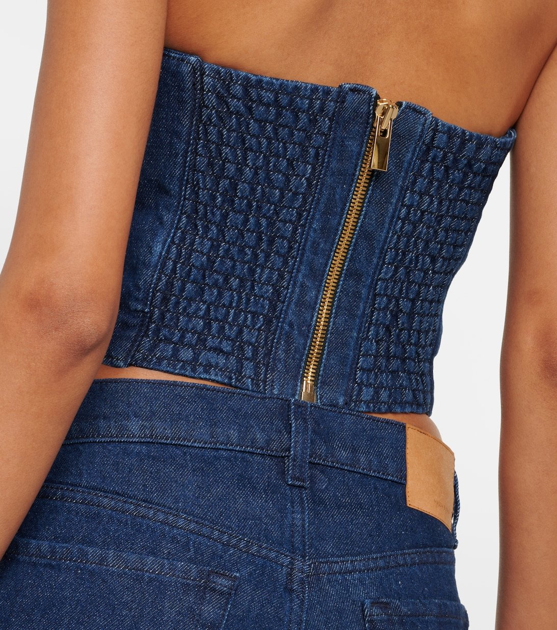 - Strapless denim corset design enhances the bustline and sculpts the waist