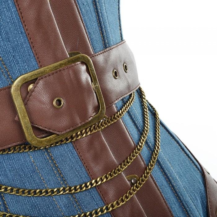- Stylish faux leather denim overbust corset with bold buckle detail