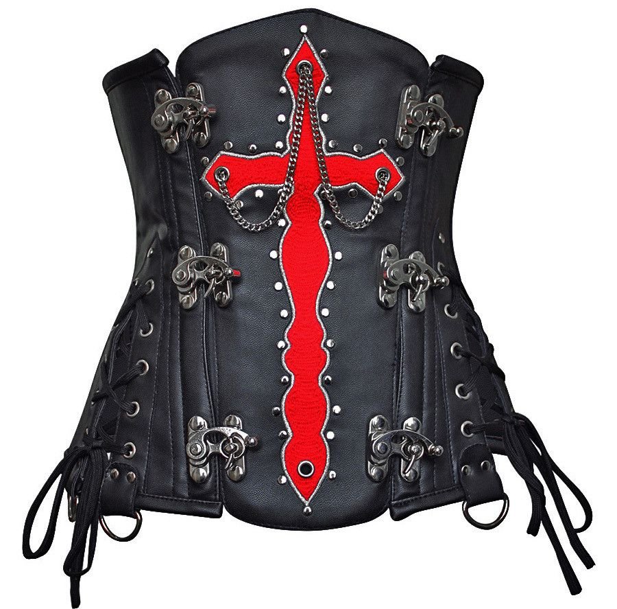 The Olesya Blood Crossed Black Faux Leather Gothic Half Corset designed with gothic edge and modern structure. This black leather corset brings the perfect mix of fashion and function. It defines curves with strength and gives every outfit a sharp and commanding touch. The leather bodice feels strong yet comfortable, and the smooth finish makes it versatile for both evening wear and alternative styling.