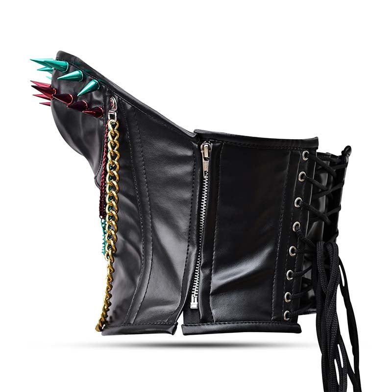 - Longline steel boned corset piece with cord lacing, silver zip, steel busk, bullets, and chains.