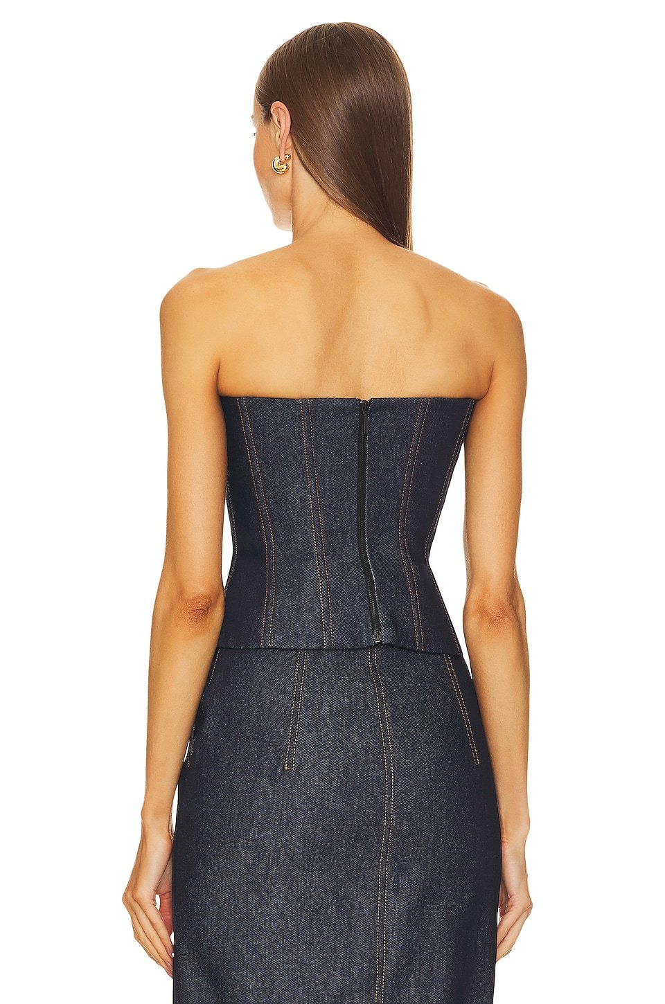 - Denim bustier top offers 2-5″ waist reduction for a sculpted silhouette.