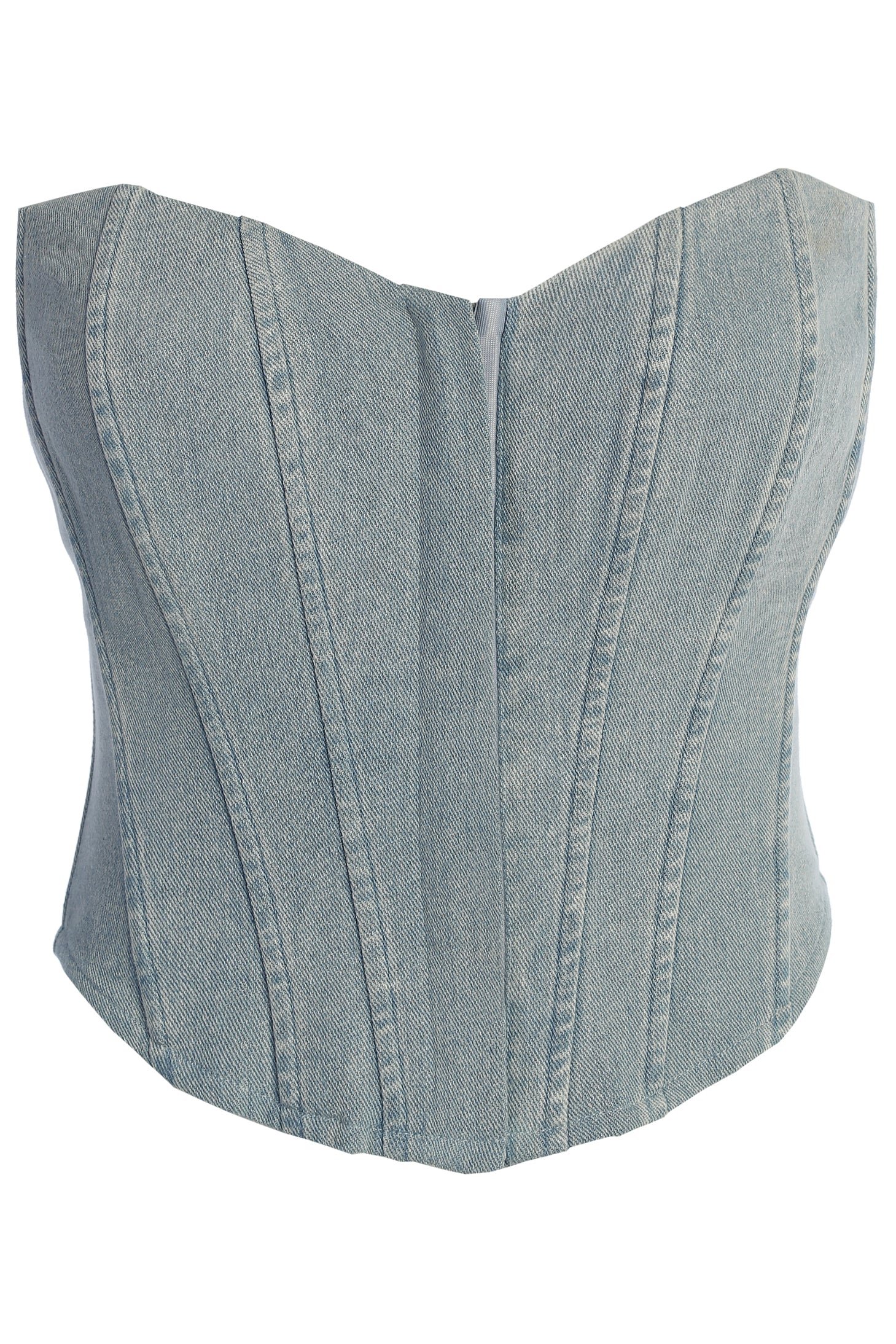 - Fully boned denim bustier top for strong structure and waist shaping
