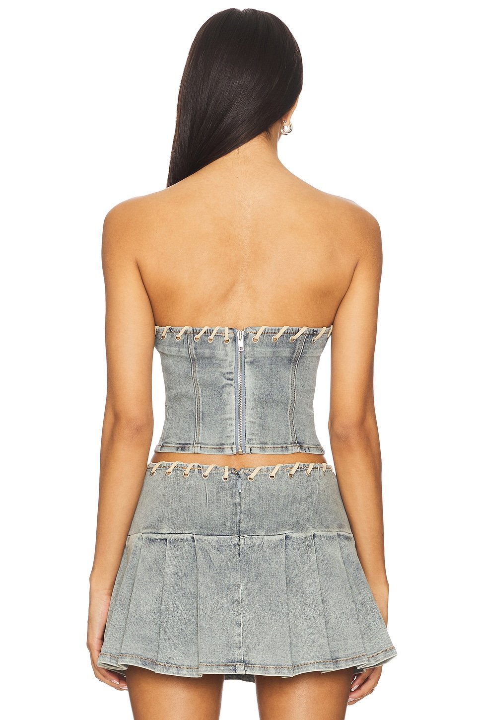 This grey denim corset features silver-tone grommet detailing with intentional fading for a stylish finish. The back zip closure ensures a secure fit and keeps the front sleek. The cropped corset design pairs easily with skirts, jeans, or high-waist pants. This corset strapless top enhances the bustline while sculpting the waist, creating a flattering silhouette. The corset crop top style makes it versatile for layering or wearing solo as a statement piece.