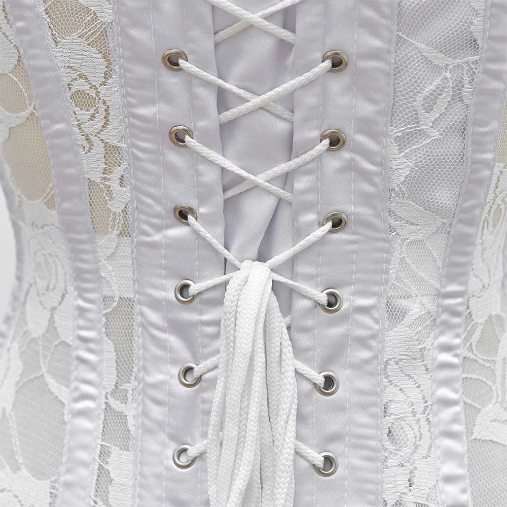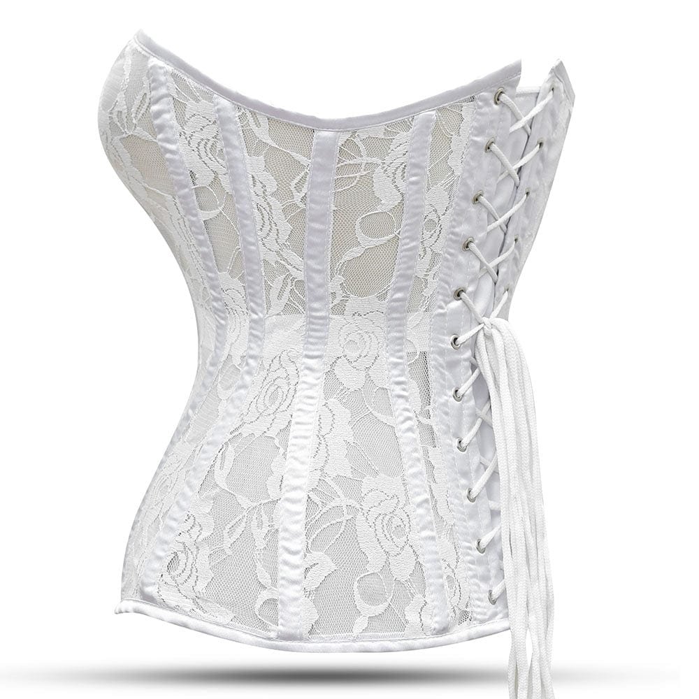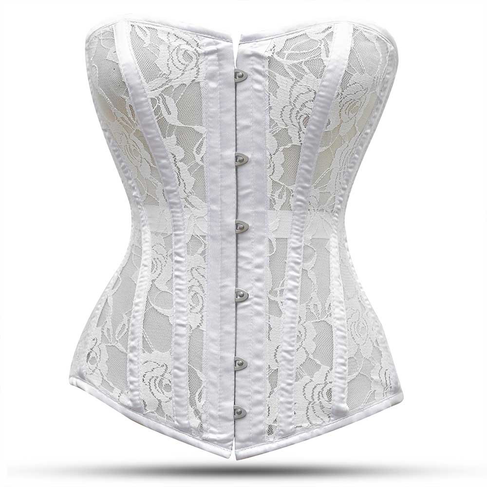 - Authentic steel boned corset in breathable white mesh with cotton twill lining.