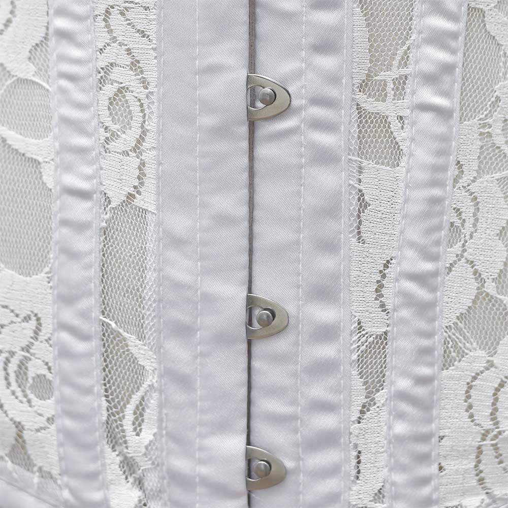 This steel boned overbust corset is built with a structured bodice that gives a secure fit. White mesh fabric overbust corset top includes a pointed overbust cut that flatters the bustline and enhances natural curves. The strong cord lacing at the back and steel busk at the front make it easy to adjust for a 4–5 inch waist reduction. With reinforced hip gores, this hips and curves corset ensures smooth shaping for a Victorian hourglass corset silhouette. The longline corset piece makes it ideal for taller frames or those who prefer full-coverage corset shaping.